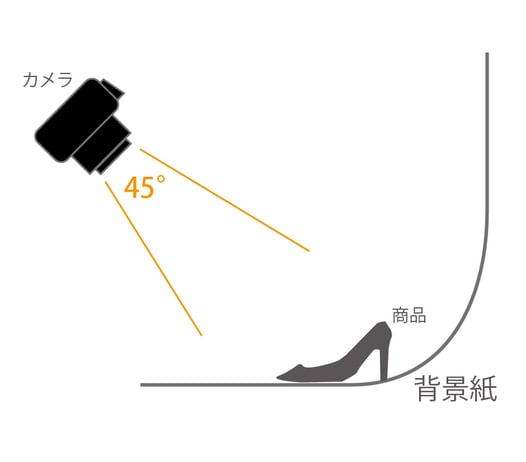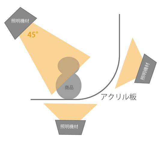 ライトは商品に対して45°程度の角度または真上になるようにあてると、商品の凹凸によって出来る影を最小限に抑えられます。