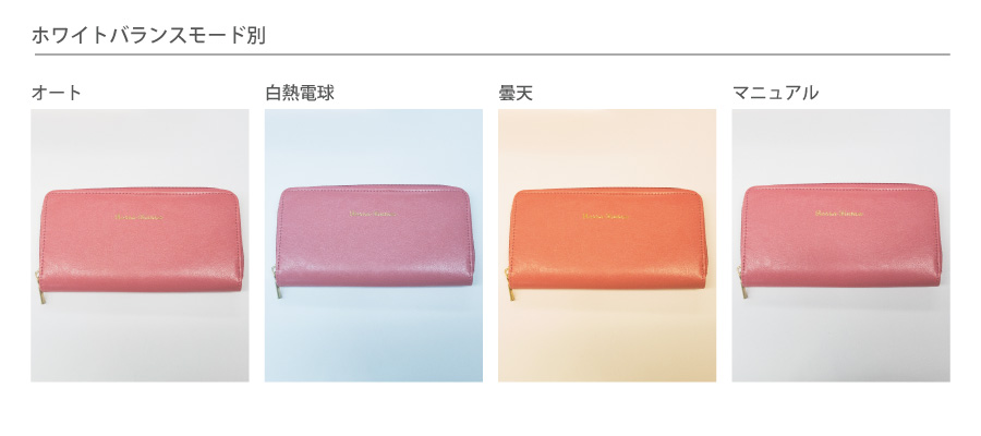 ピンクの財布の実際の色に一番近いのはマニュアルで撮影した時の画像です。