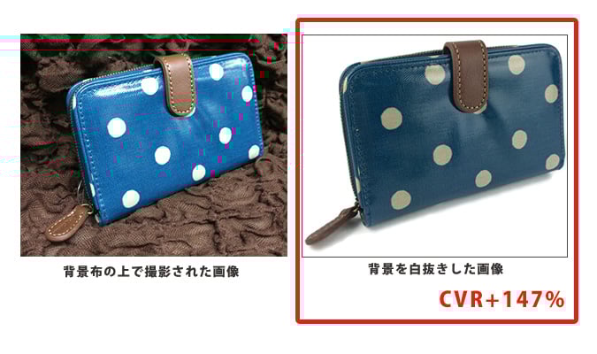 弊社では「白背景のシンプルな商品画像」と「未加工の画像(撮りっぱなしの画像)」や「白以外の背景上で撮影した画像」「人が商品を持っている画像」などを比較しました。