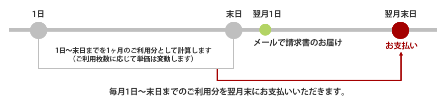 FotoMonthlyは毎月1日から末日までのご利用分を1ヶ月分として計算し、翌月1日に請求書をメールにてお送りいたします。