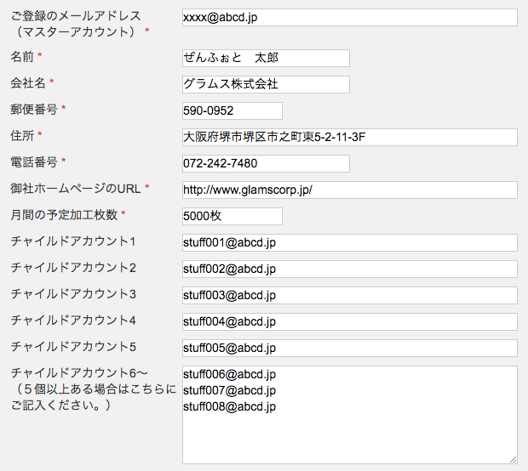 尚、チャイルドアカウントの利用をご希望の方は①で作成したアカウントのメールアドレスをフォーム内の「チャイルドアカウント」へ入力してください。