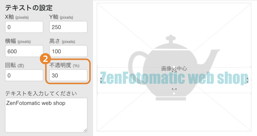 ❶テキストの不透明度をパーセントで指定することが可能です。