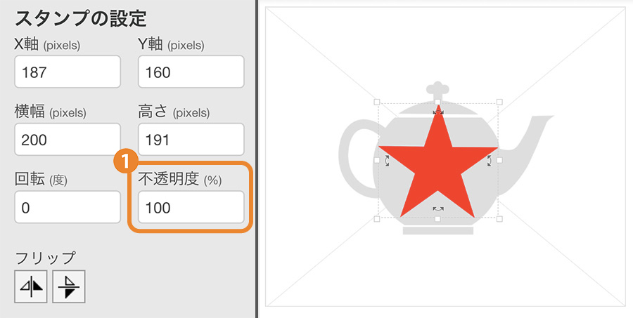 ❶スタンプの不透明度をパーセントで指定することが可能です。