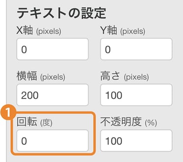 ❶【回転】に数値を入力する事でテキストの角度を変更する事が可能です。