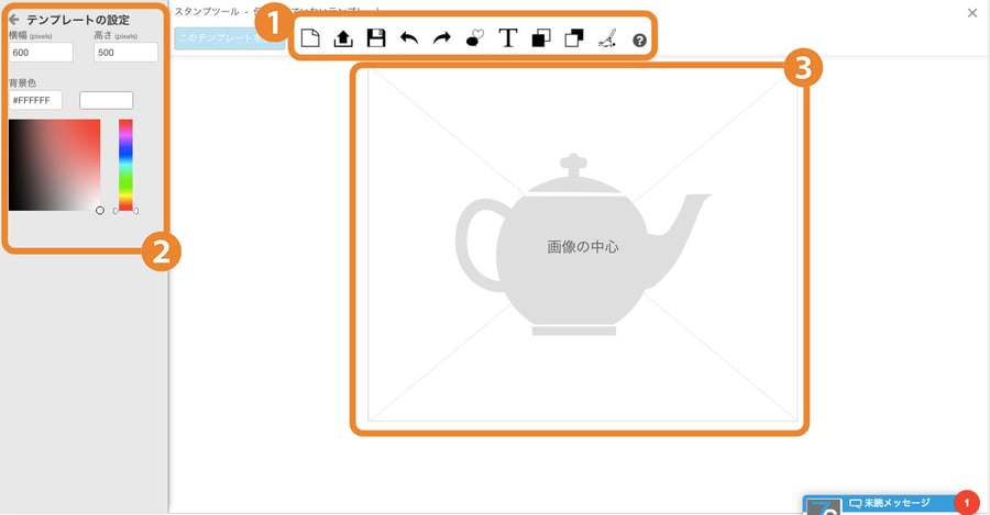 ❶テンプレートに追加するスタンプを選んだり保存など基本の操作を行うパネルです。