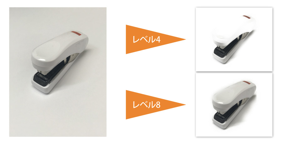 初期設定のレベル4では被写体ごと切り抜かれてしまいましたが、被写体の検出レベルを最大の8まであげて加工すると、切り抜きの難しい白色の商品もうまく加工する事ができました。
