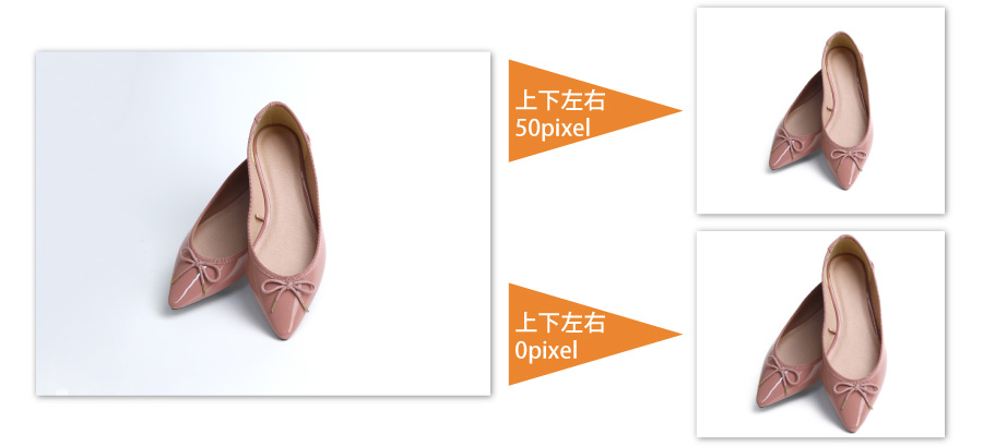 上下左右にそれぞれ「0Pixel」の余白値を設定すると被写体の周辺に余白をつけないよう商品をできるだけ大きく表示します。