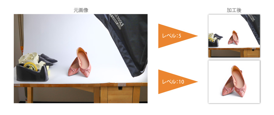 商品の周りに写り込みがある場合は初期設定のレベル5ではうまく加工ができない事があります。