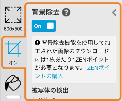 背景除去機能では背景除去の検出レベルに関する【被写体の検出】【クリーンカット】【不要な背景の除去】の項目があります。